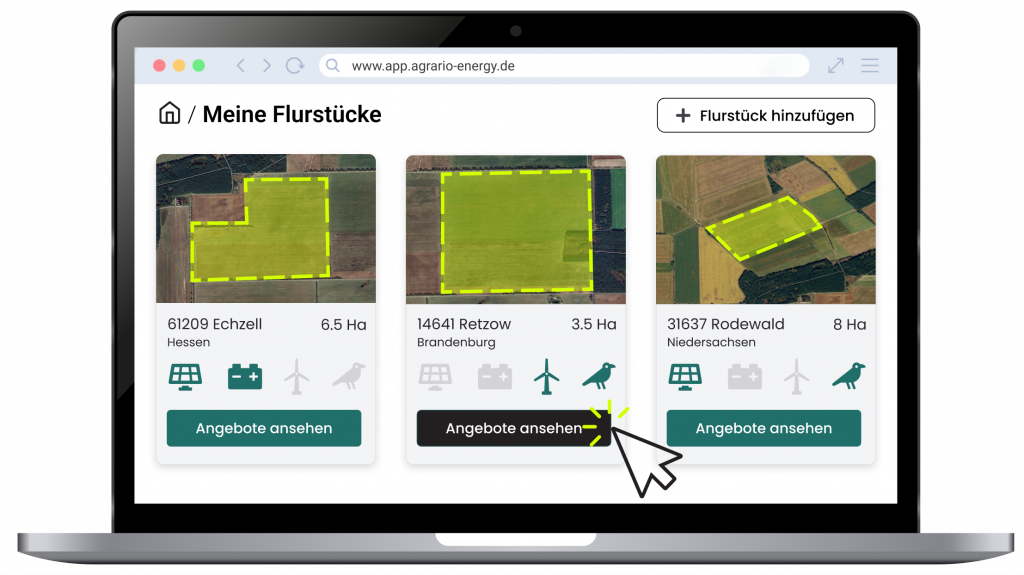 Mit der Agrario Energy Plattform analysieren Sie Ihre Flächen digital und unabhängig. Erfahren Sie, wofür sich Ihre Grundstücke eignen – ob für Solar-, Wind- oder Speicherprojekte oder für ökologische Aufwertungen – und holen Sie anonym Vergleichsangebote geprüfter Unternehmen ein.